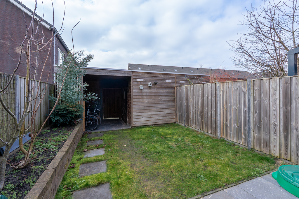 De achtertuin is gelegen op het zuidwesten, zodat je de gehele middag en avond zon hebt. Er is een vrijstaande houten berging met overkapping en achterom. Daarnaast is er een elektrisch zonnescherm om schaduw te creëeren in de warme zomerdagen.