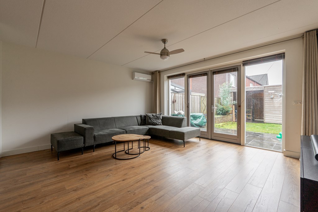 Er is ruimte voor een grote eettafel die in verbinding staat met de woonkamer. Vanwege een uitbouw is de woonkamer zeer ruim, waardoor je qua indeling alle kanten op kunt. De woonkamer is voorzien van vloerverwarming en een airconditioning. Via de openslaande deuren bereik je de achtertuin, daarover later meer!