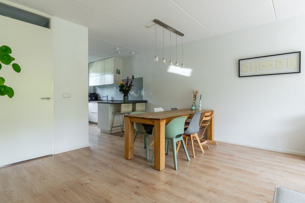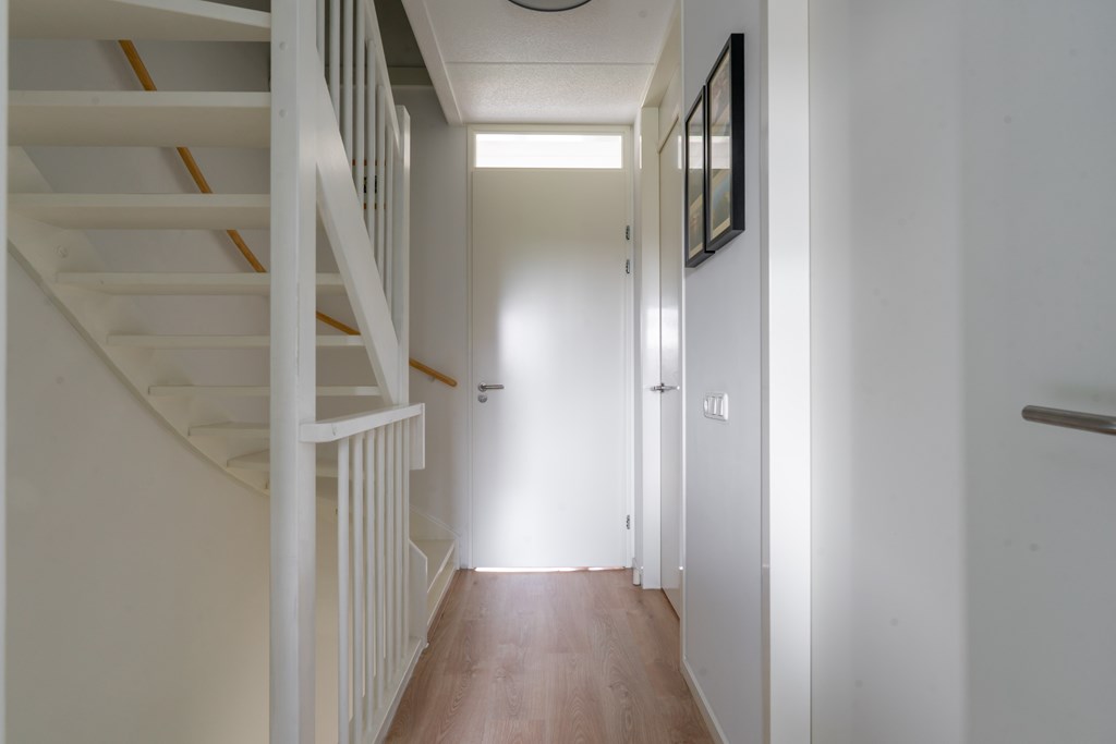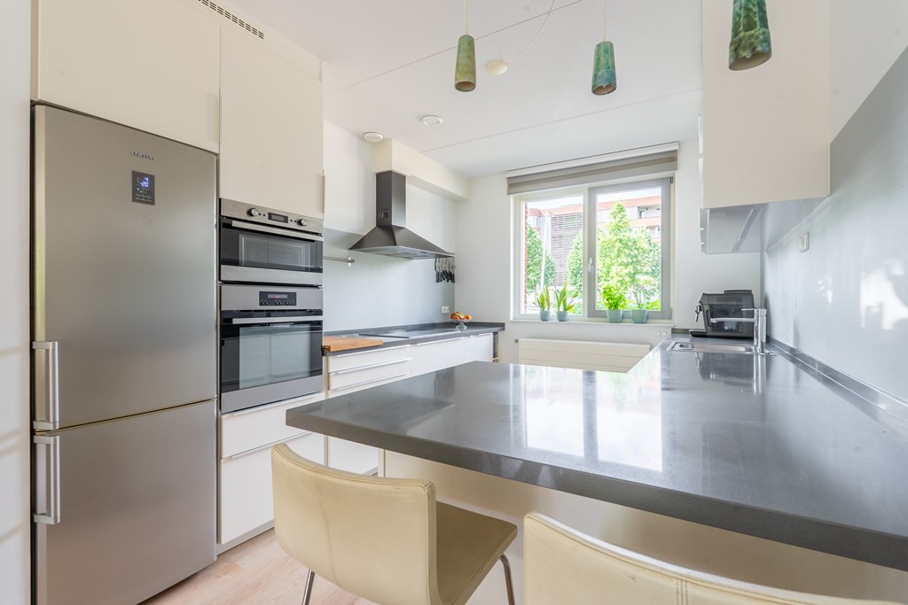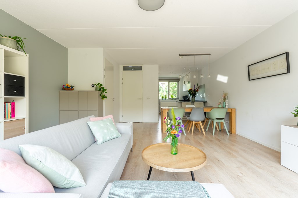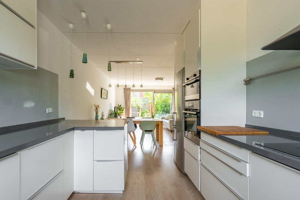 Je komt binnen in de hal met toilet en trapopgang. De woonkamer voelt ruim en licht aan dankzij de grote ramen en de schuifpui naar de tuin. Aan de voorzijde ligt de moderne open keuken, strak en compleet ingericht met onder andere een inductiekookplaat, dubbele spoelbak, oven, combimagnetron, vaatwasser en een stijlvol aanrechtblad met bar – ideaal voor een snel ontbijt of gezellig borrelen.
