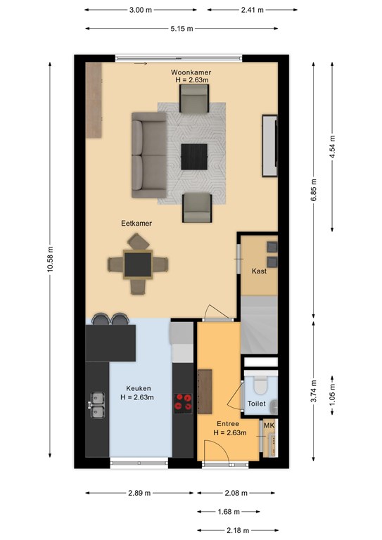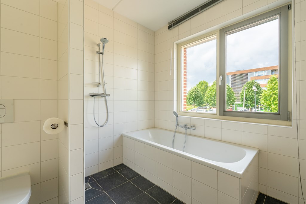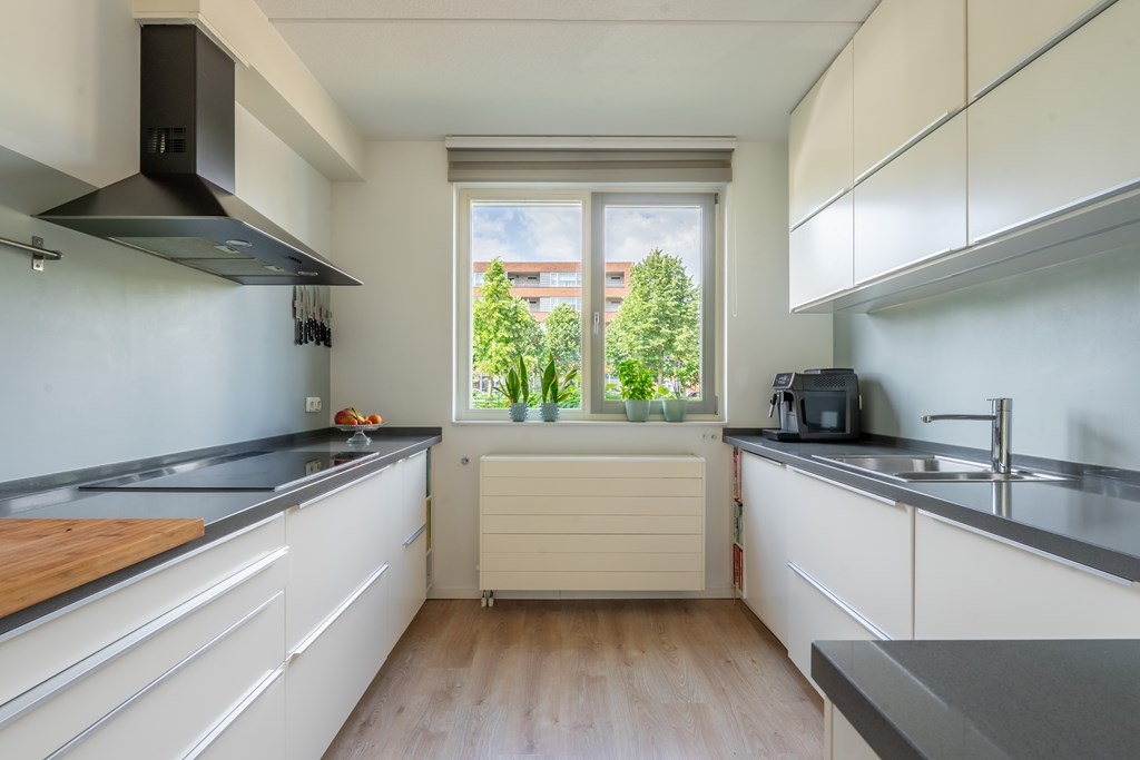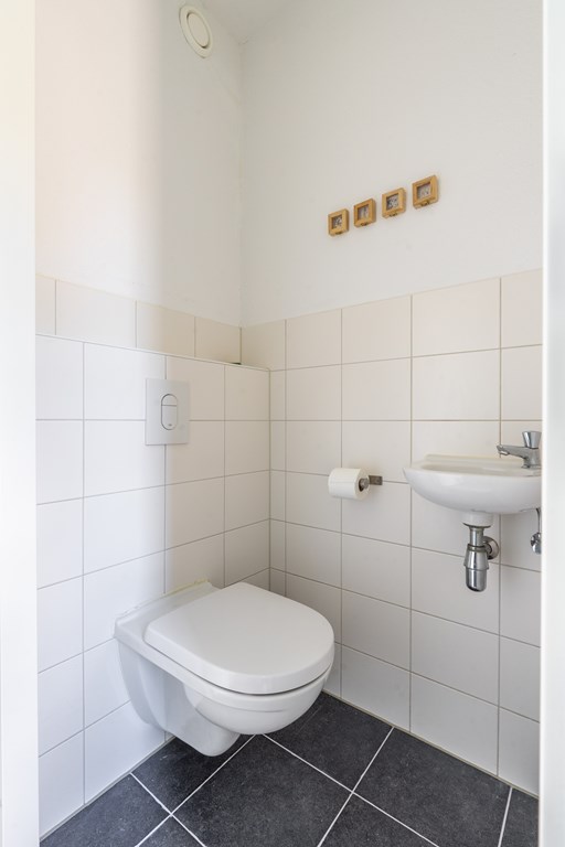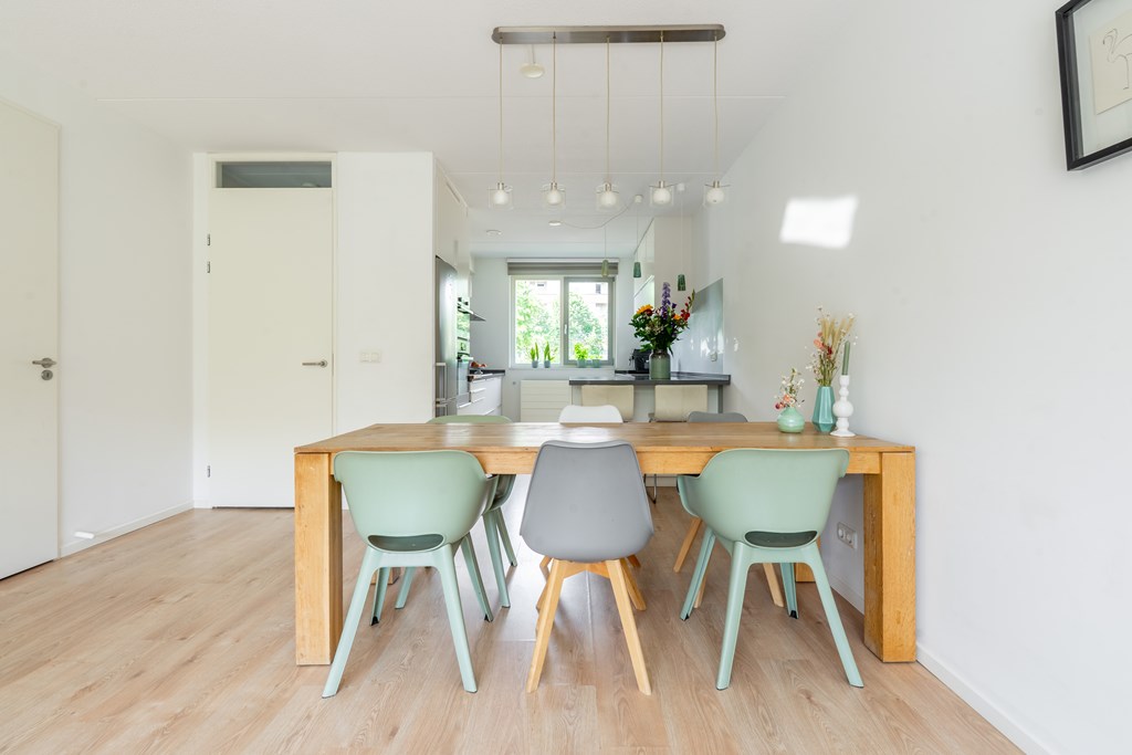 Je komt binnen in de hal met toilet en trapopgang. De woonkamer voelt ruim en licht aan dankzij de grote ramen en de schuifpui naar de tuin. Aan de voorzijde ligt de moderne open keuken, strak en compleet ingericht met onder andere een inductiekookplaat, dubbele spoelbak, oven, combimagnetron, vaatwasser en een stijlvol aanrechtblad met bar – ideaal voor een snel ontbijt of gezellig borrelen.