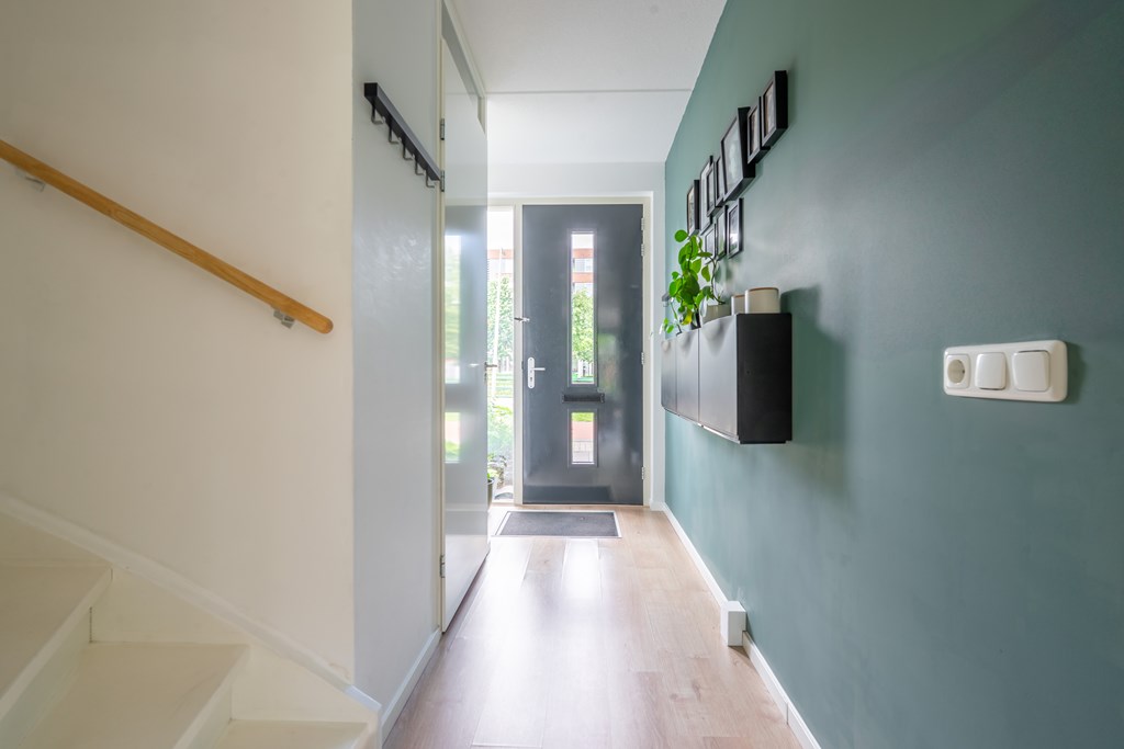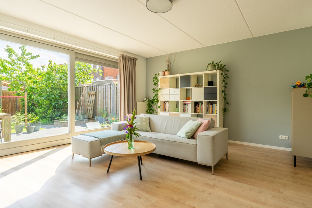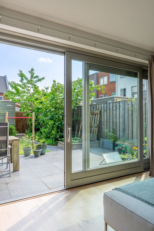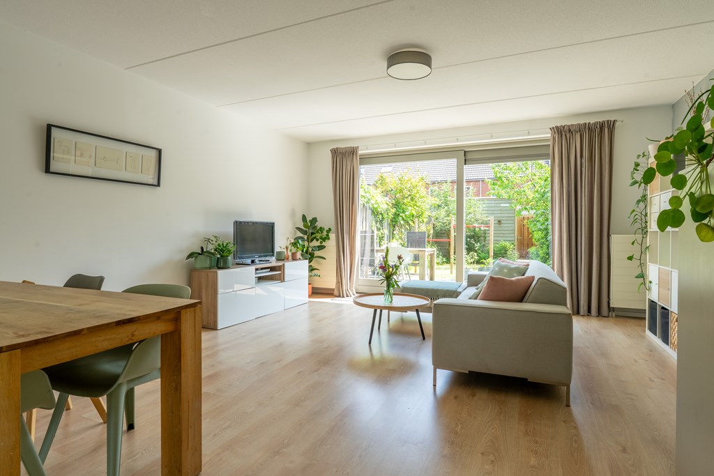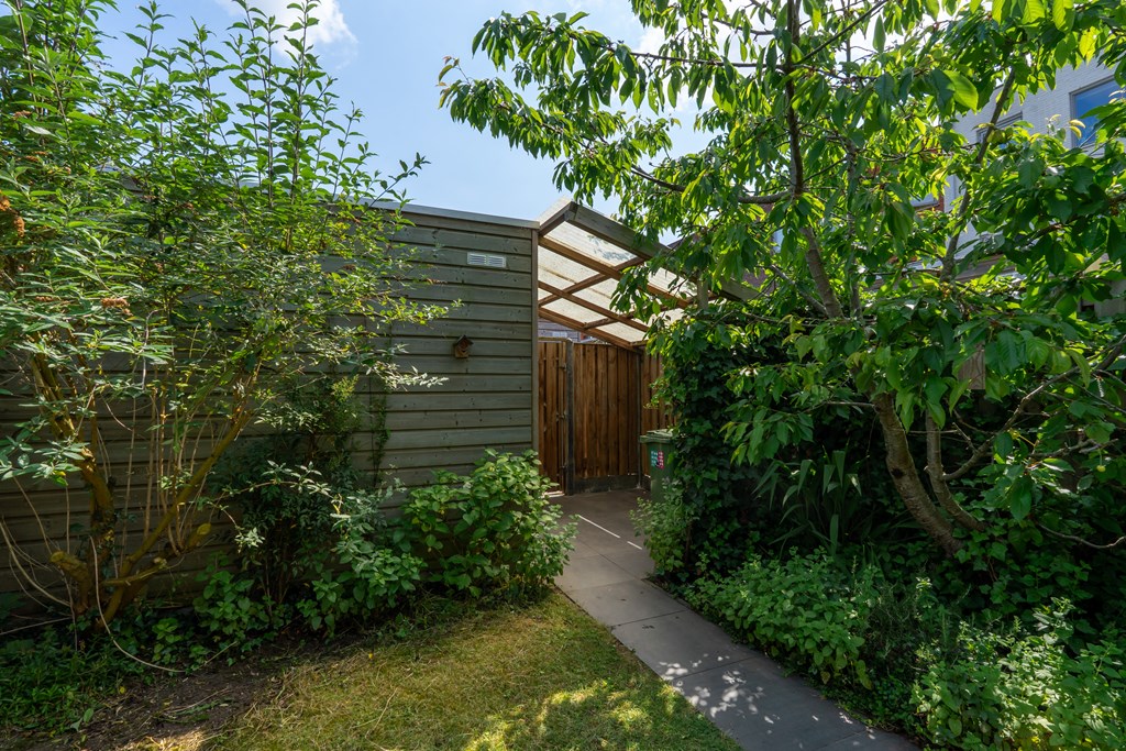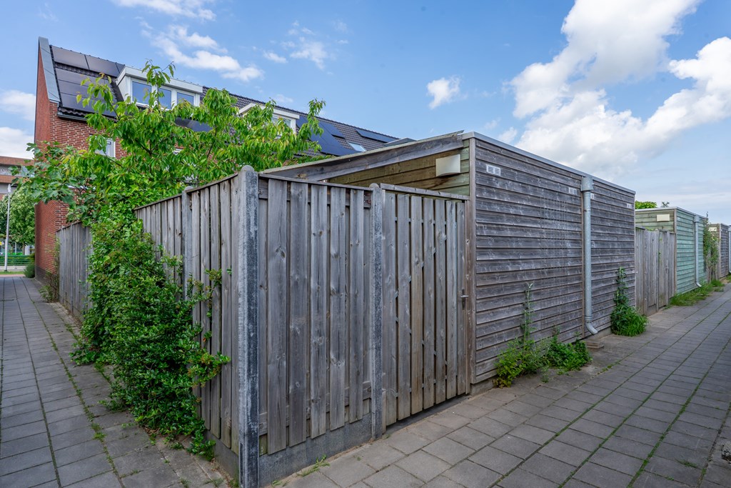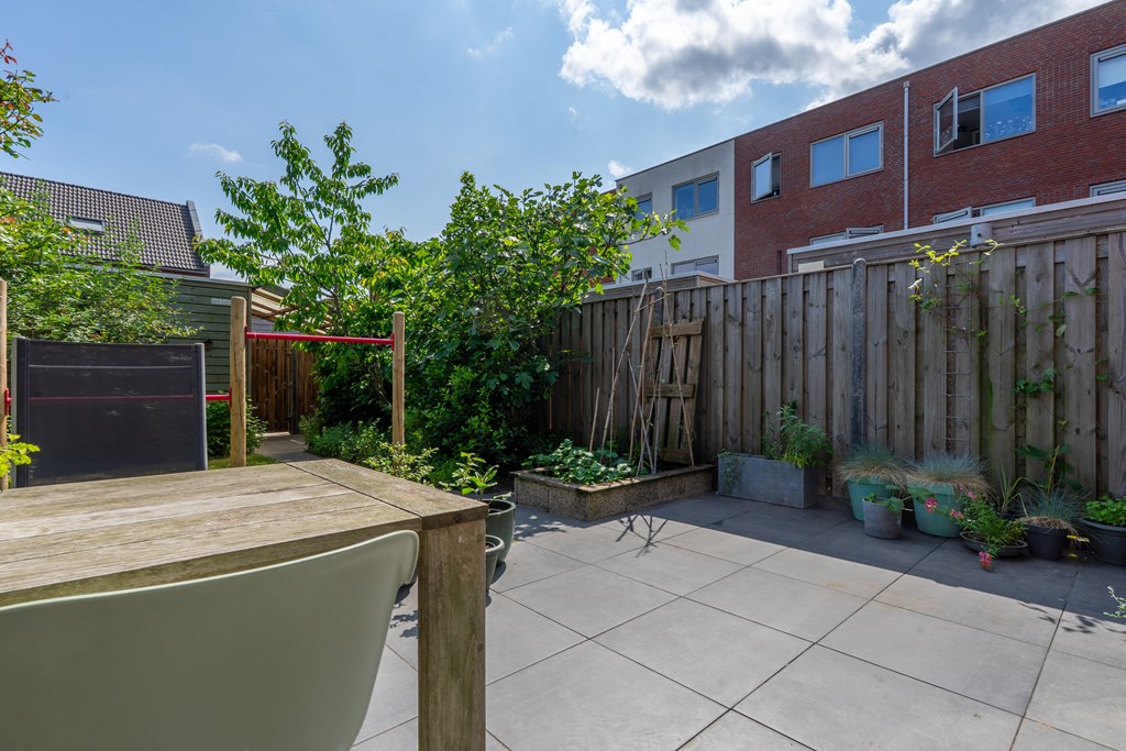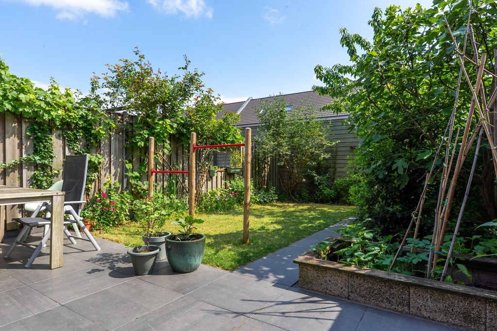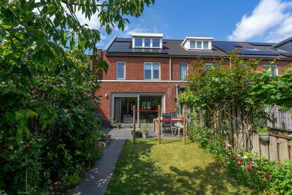 De zonnige achtertuin is een waar pluspunt: gericht op het zuiden, met zowel zon- als schaduwplekken, veel groen én eetbare planten. Achterin vind je een praktische berging met overkapping en achterom – handig voor fietsen en extra opslag. Aan de voorzijde is een eigen laadpunt (11 kW) voor je elektrische auto geplaatst.