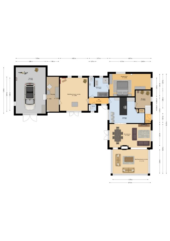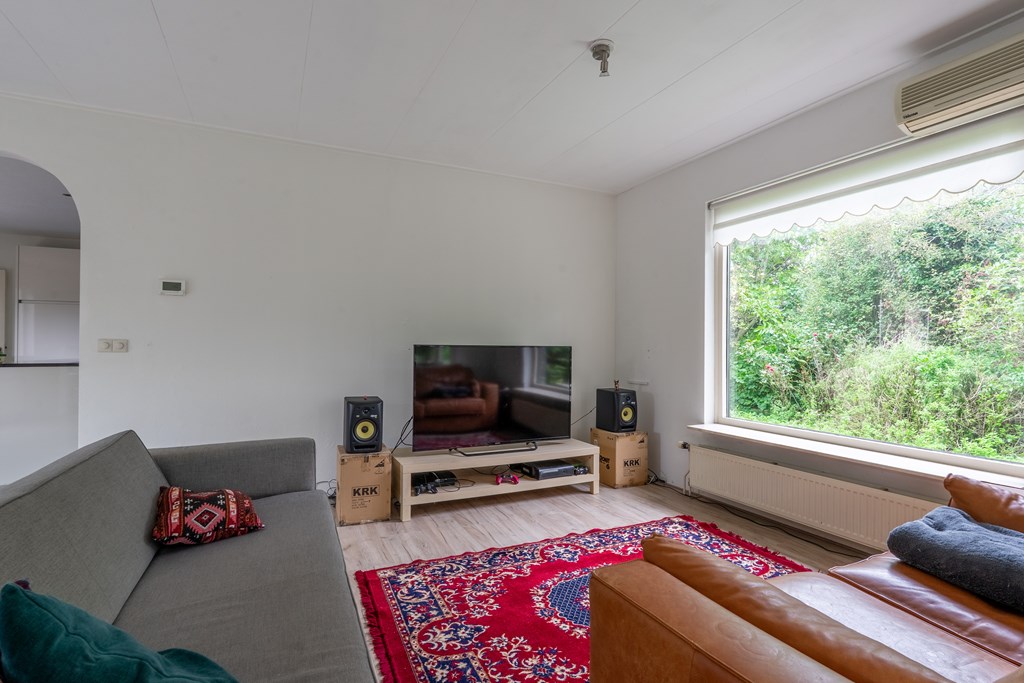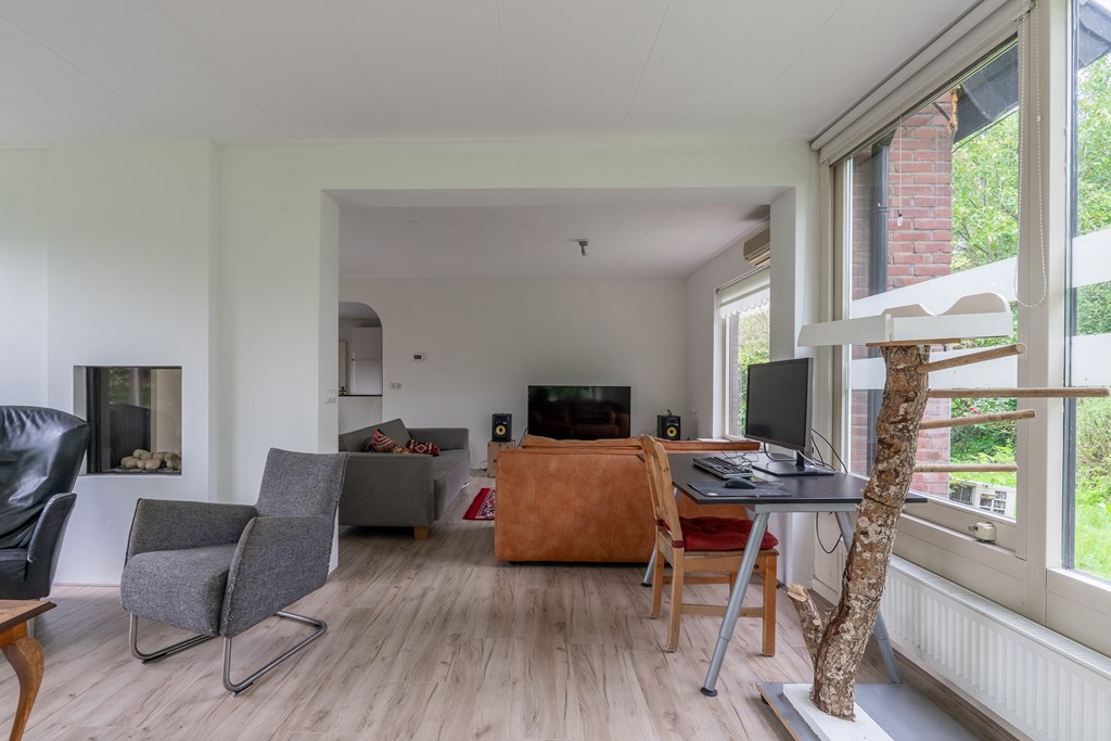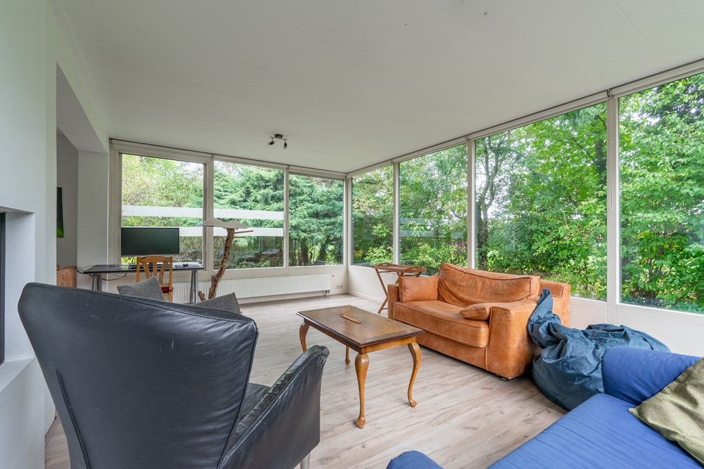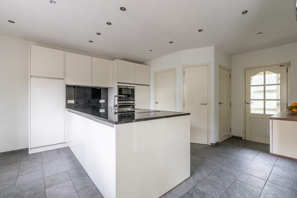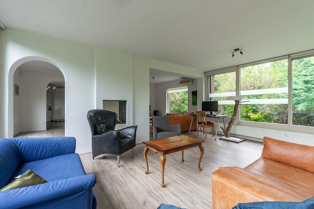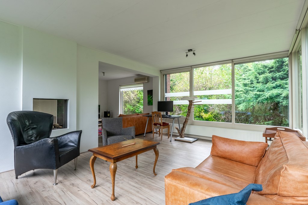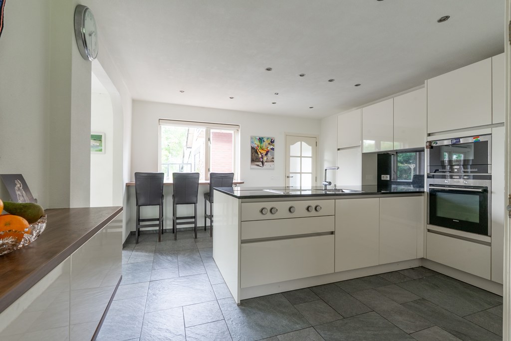 Entree met trapopgang, garderobekamer, provisiekast en meterkast. Vanuit de hal kom je in de moderne leefkeuken met kookeiland en baropstelling – een echte centrale plek in huis. De keuken staat in open verbinding met de lichte woonkamer, voorzien van serre, sfeervolle gashaard en grote raampartijen die het prachtige uitzicht omlijsten.
