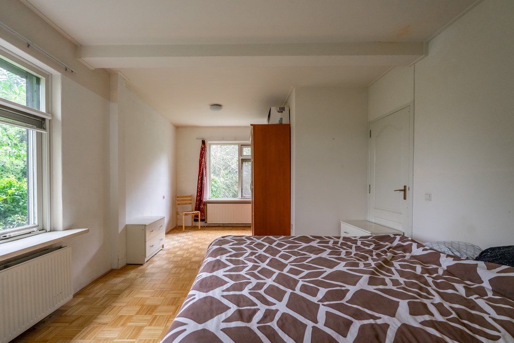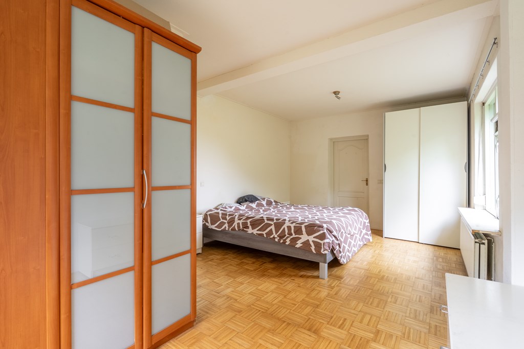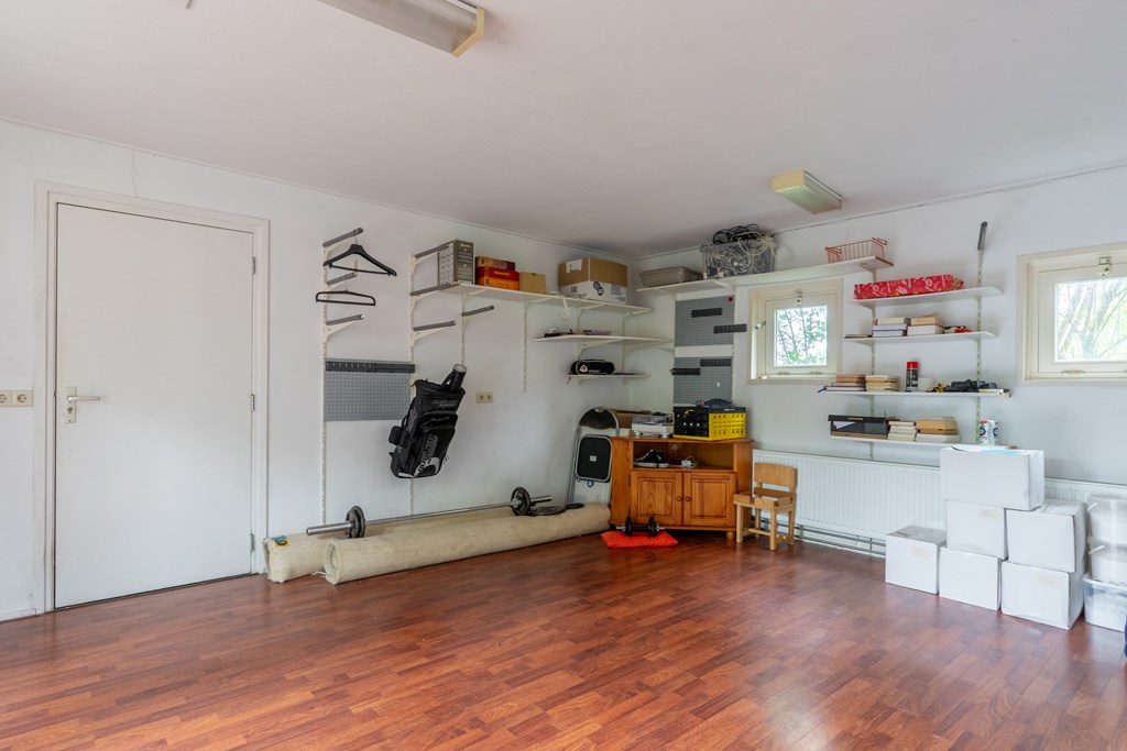 Aangrenzend ligt een tussenhal met achteringang en toiletruimte. In het achterhuis bevindt zich de hoofdslaapkamer met badkamer en suite – ideaal voor gelijkvloers wonen. Daarnaast is er een werkkamer met dubbele tuindeuren, bergzolder en toegang tot de bijkeuken/wasruimte en garage.
