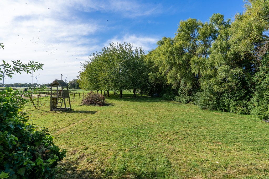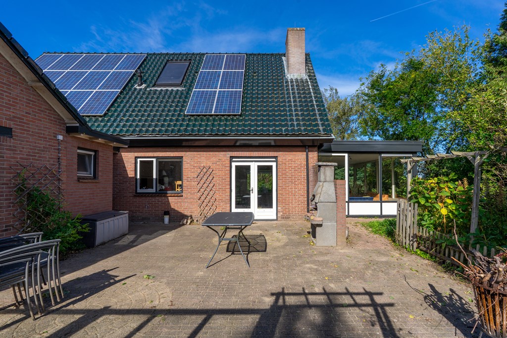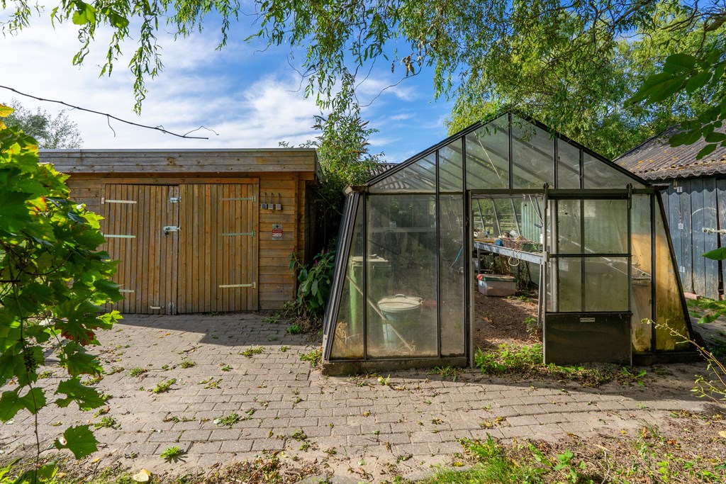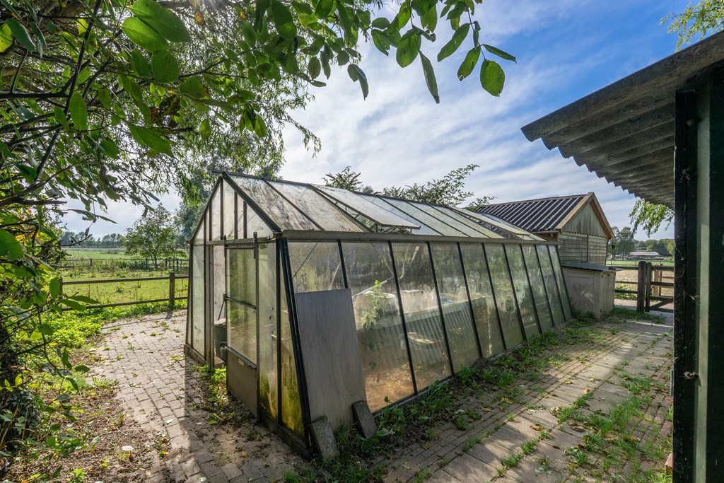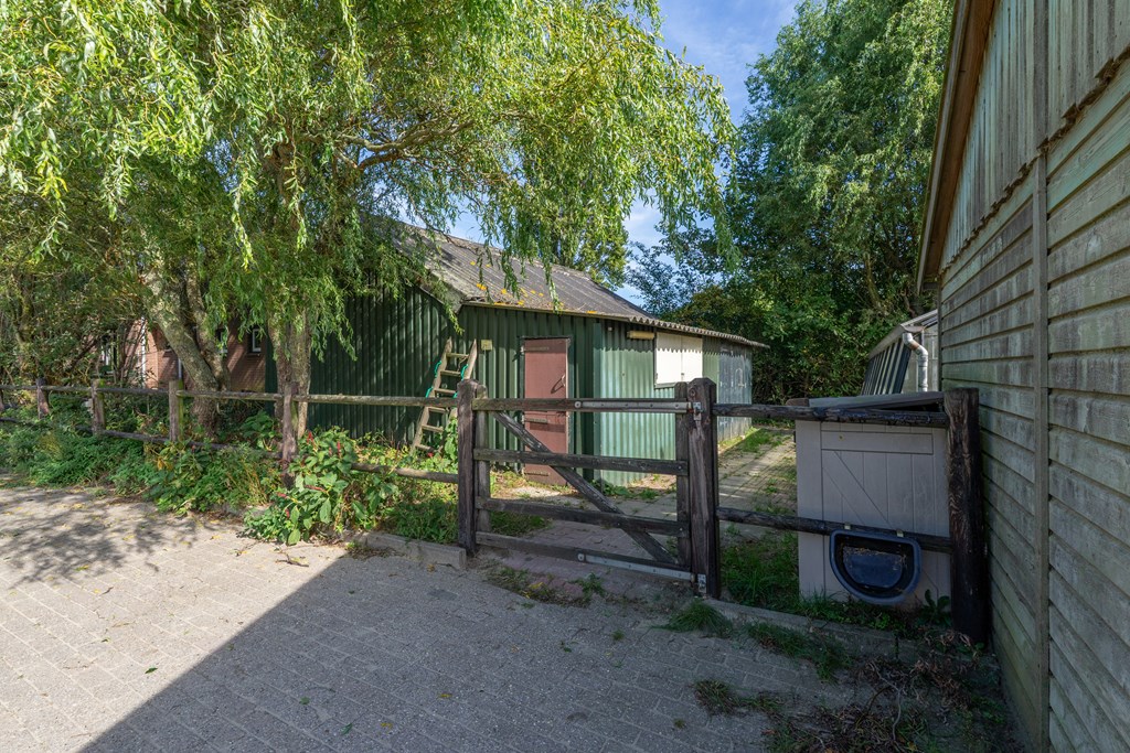 Via de oprit met bezoekersparkeerplaats bereik je het erf. Het perceel herbergt een multifunctioneel bijgebouw/dubbele garage, diverse schuren, een plantenkas en een keurige tuin rondom de woning met terras op het zuiden, vijverpartij, gazon en borders.