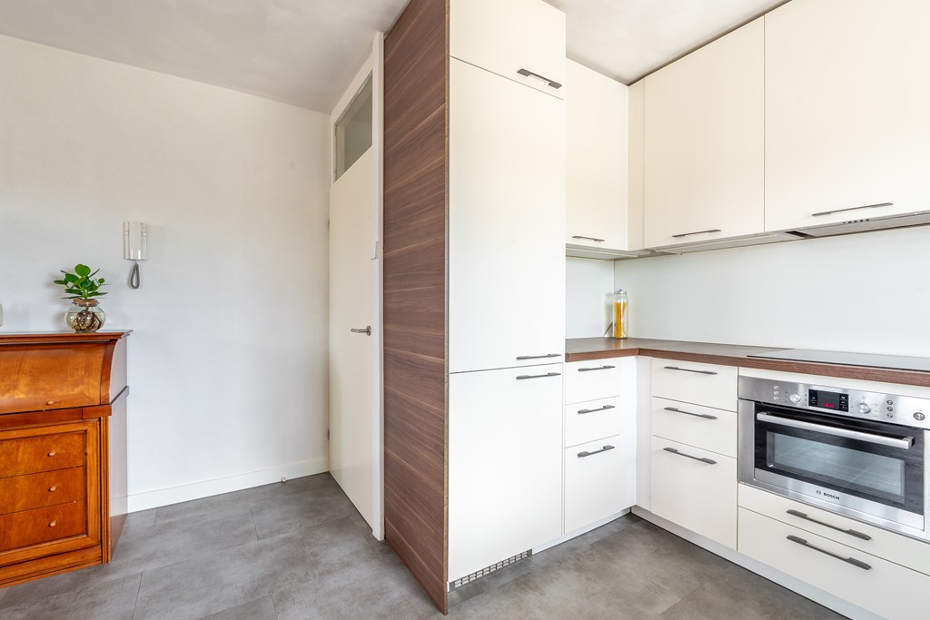 De moderne, ruime, open keuken is uitgerust met onder andere een inductiekookplaat, vaatwasser en combi-oven. Dankzij het grote raam is er veel lichtinval en een mooi uitzicht tijdens het koken.