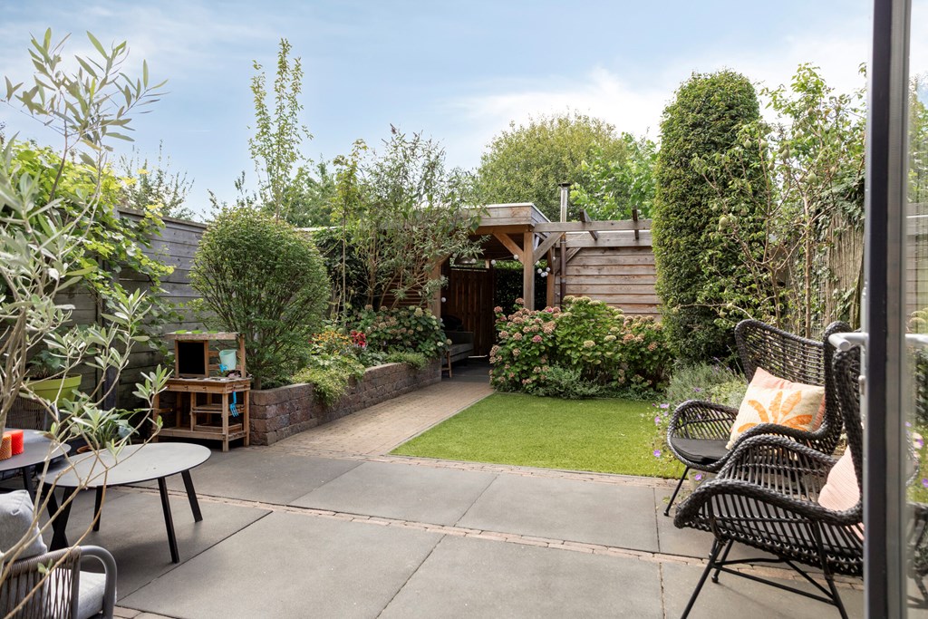 De zonnige achtertuin ligt op het zuidwesten en is keurig aangelegd. Doordat er geen directe achterburen zijn, geniet je hier van veel privacy en rust. Achterin de tuin bevindt zich een praktische berging voor fietsen en tuingereedschap. Met meerdere zitjes is dit een heerlijke plek om tot laat in de avond van de zon te genieten.