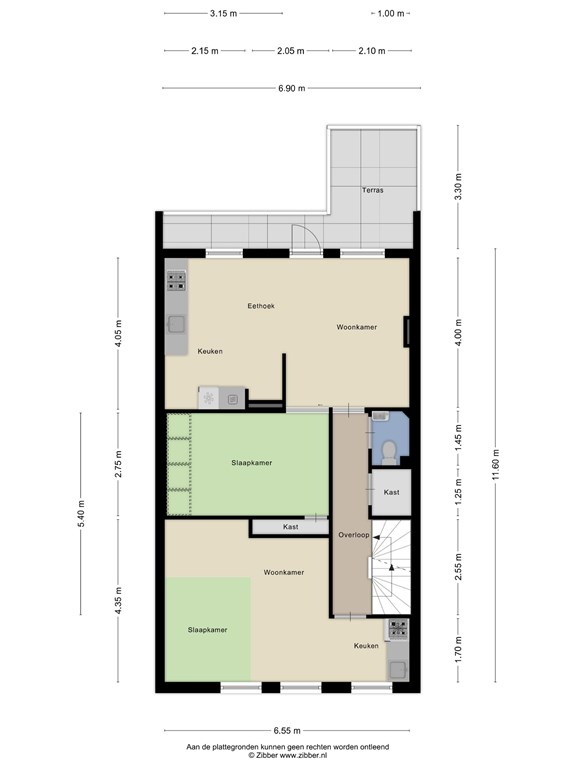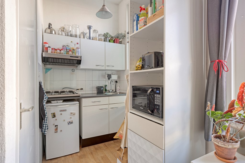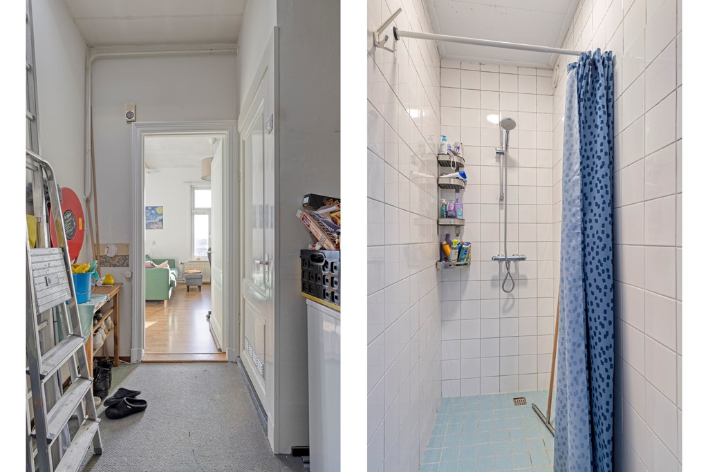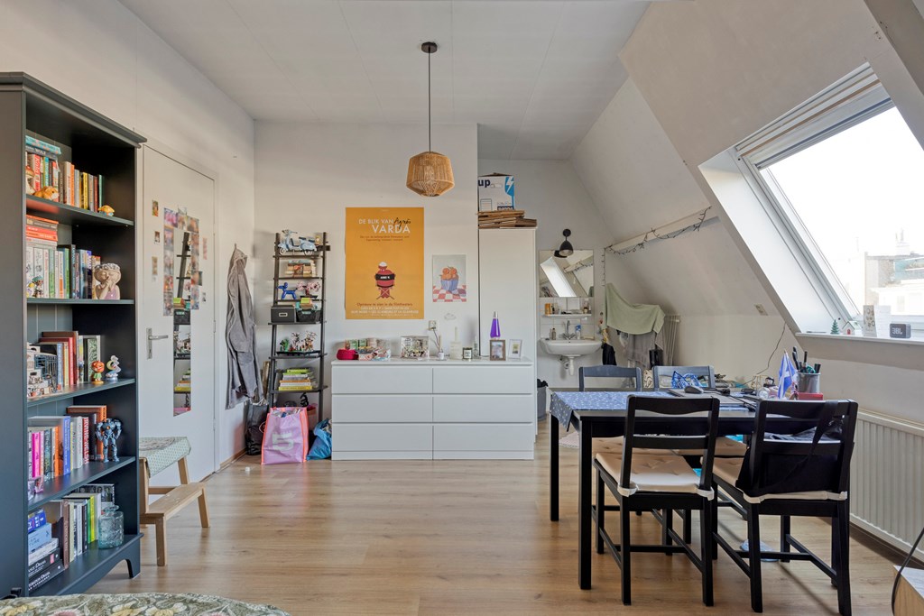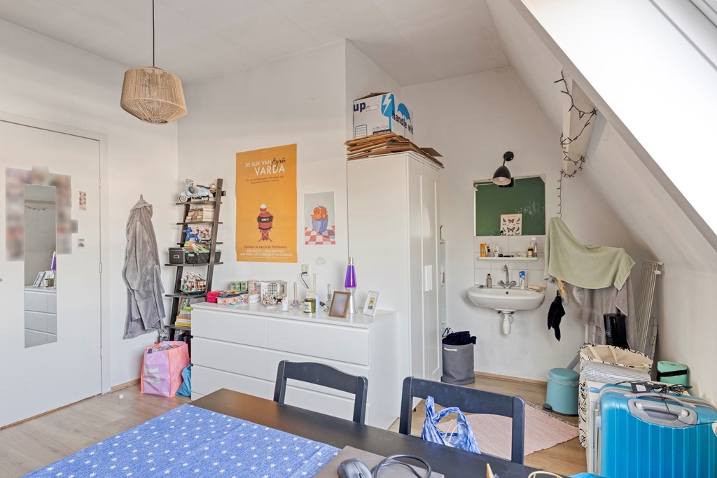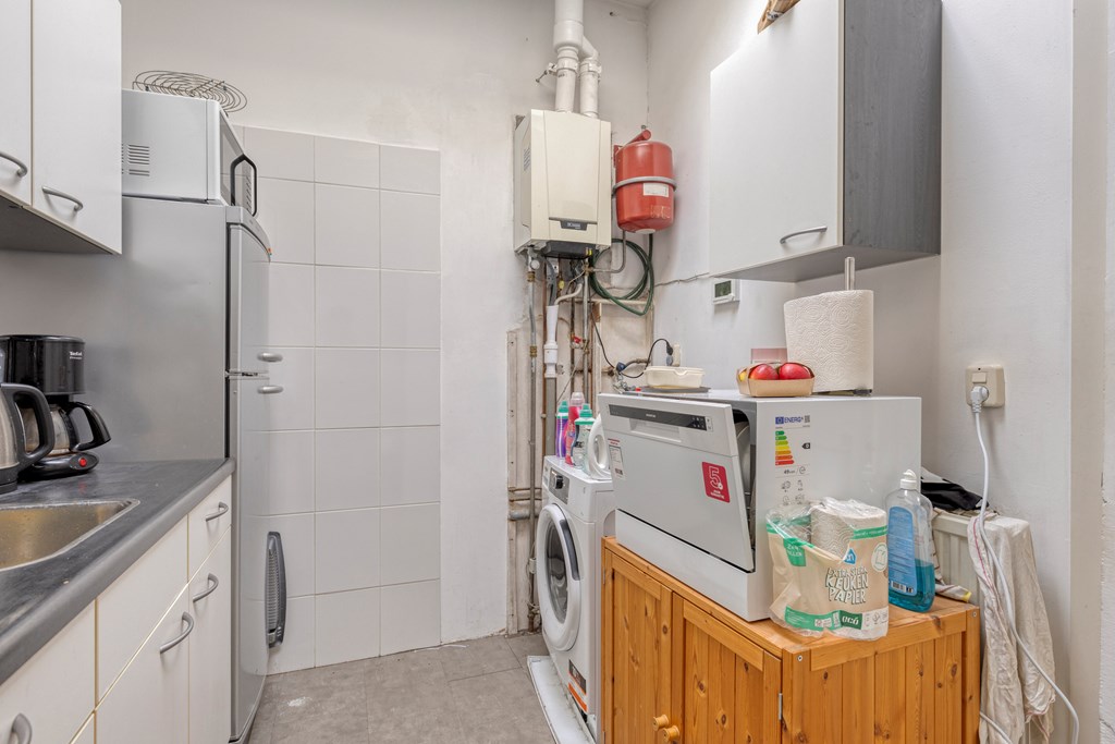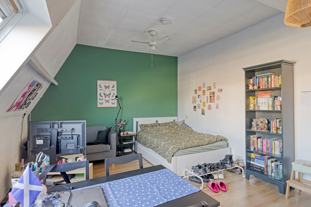 Via de trap bereik je de overloop van de tweede verdieping met gemeenschappelijke keuken, was ruimte en badkamer. Aan de voor- en achterzijde van het pand zijn er twee studio's met eigen wastafel.