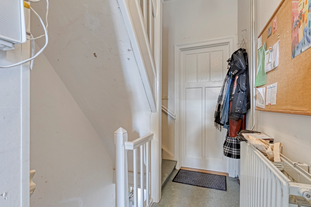 Via de gemeenschappelijke voortuin bereik je de entree van deze bovenwoning. Er is vanuit hier een kelder bereikbaar van circa 6 m2.