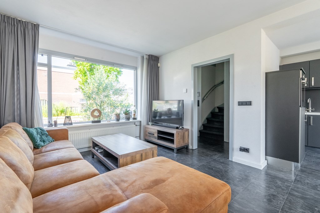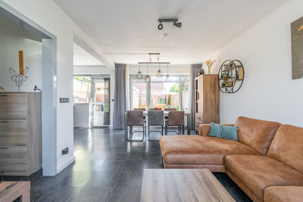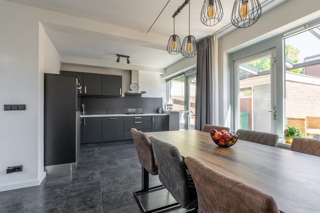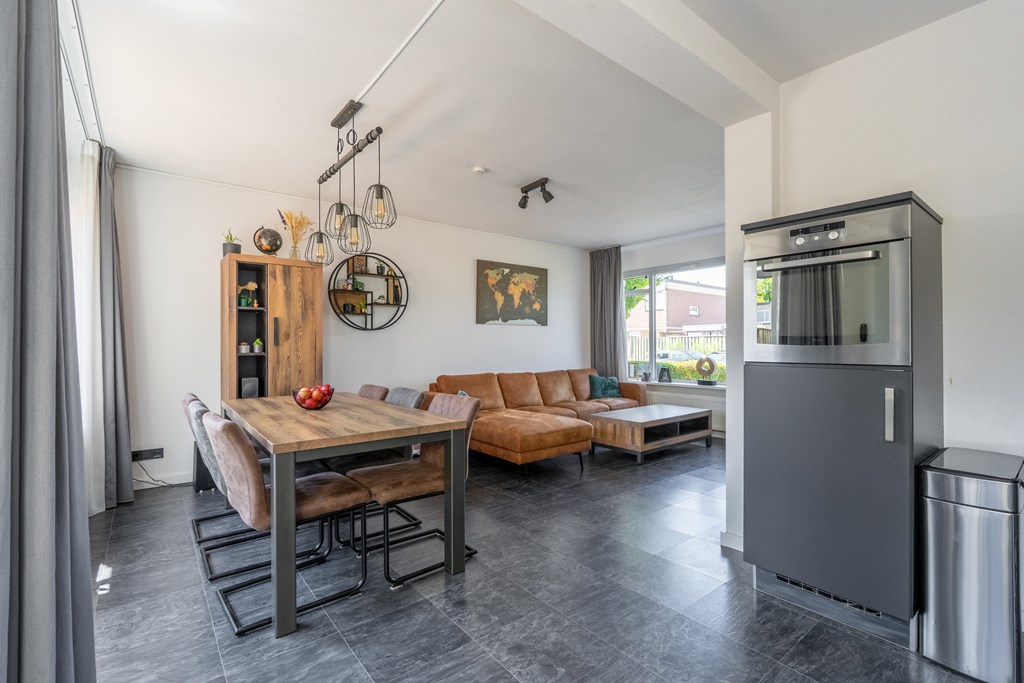 Via de strakke voortuin bereik je de voordeur van de woning. Je komt binnen in de hal met toegang tot het moderne toilet, trapopgang naar de eerste verdieping en toegang tot de woonkamer. De woonkamer is gelegen aan de voorzijde van de woning. Er is veel natuurlijk daglicht door de grote raampartijen aan de voorzijde van de woning. Er is voldoende ruimte voor een grote zithoek. Aan de achterzijde van de woning vind je de eetkamer met open keuken. Een van de vorige eigenaren heeft de muur doorgebroken waardoor er een grote ruimte ontstaat met verbinding tussen woonkamer, eetkamer en keuken. Vanuit de achterzijde heb je zicht op de diepe achtertuin. Daarover later meer!