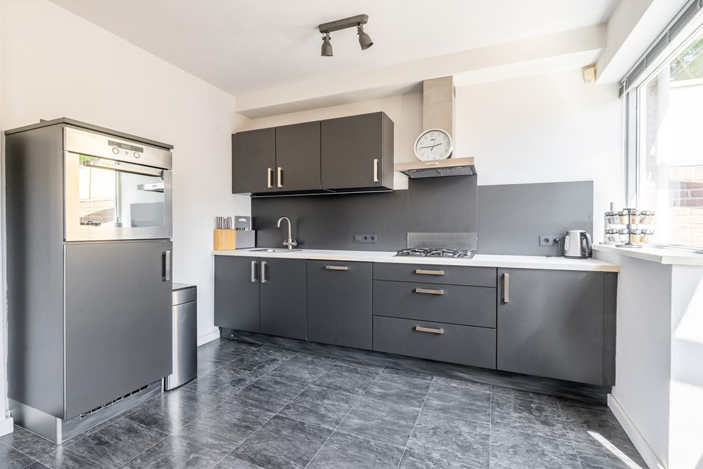 De keuken is modern ingericht met diverse inbouwapparatuur. Daarnaast is er ruimte voor een grote eettafel. De begane grond is volledig afgewerkt met een nette vloer, strakke wanden en plafonds.