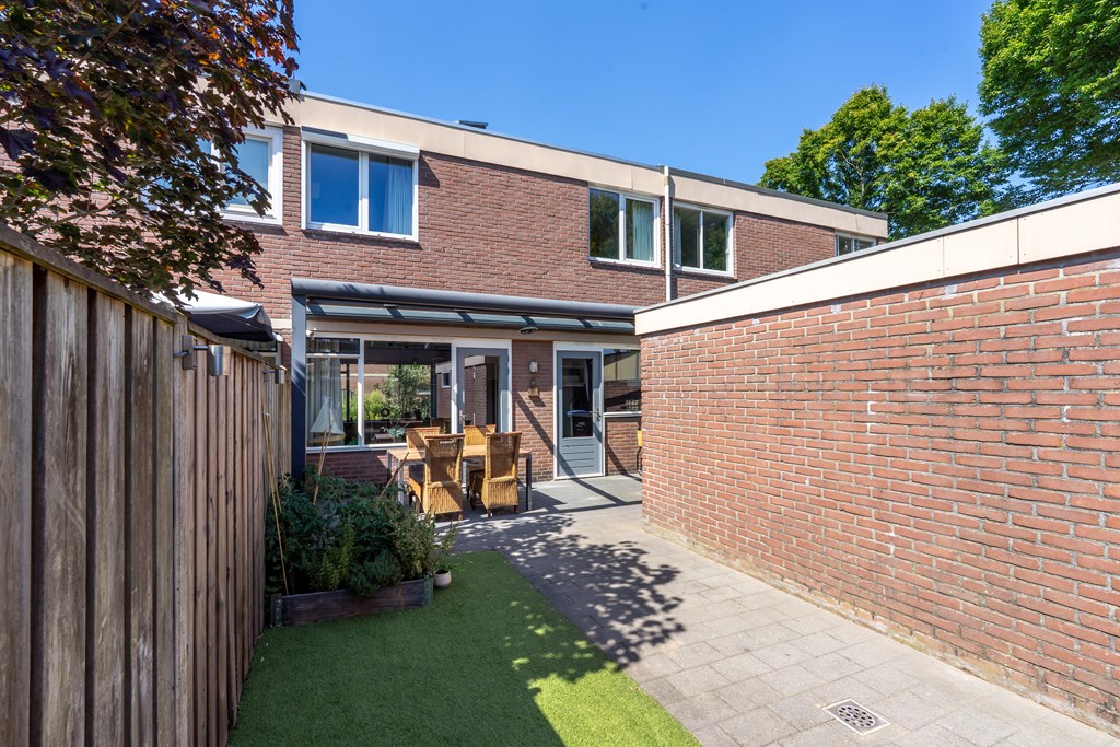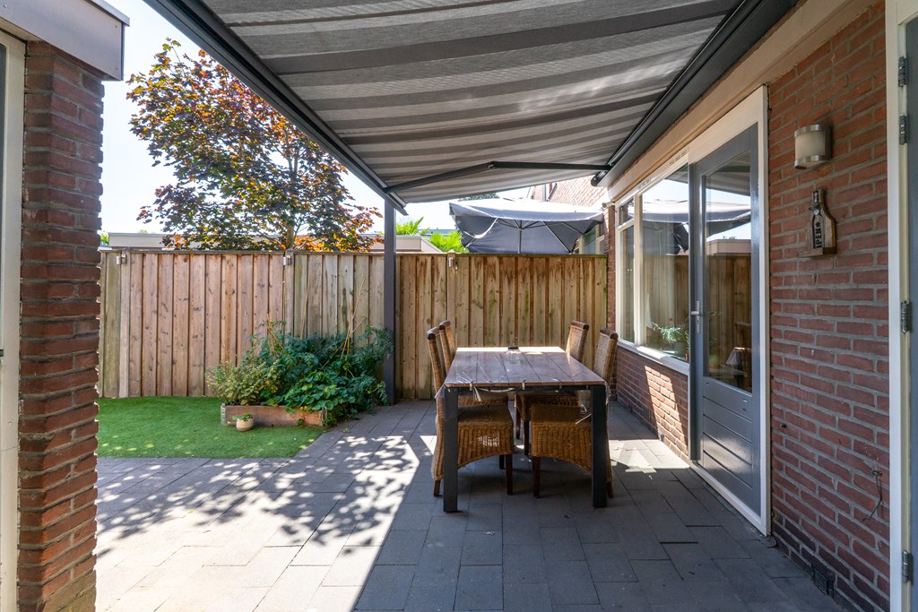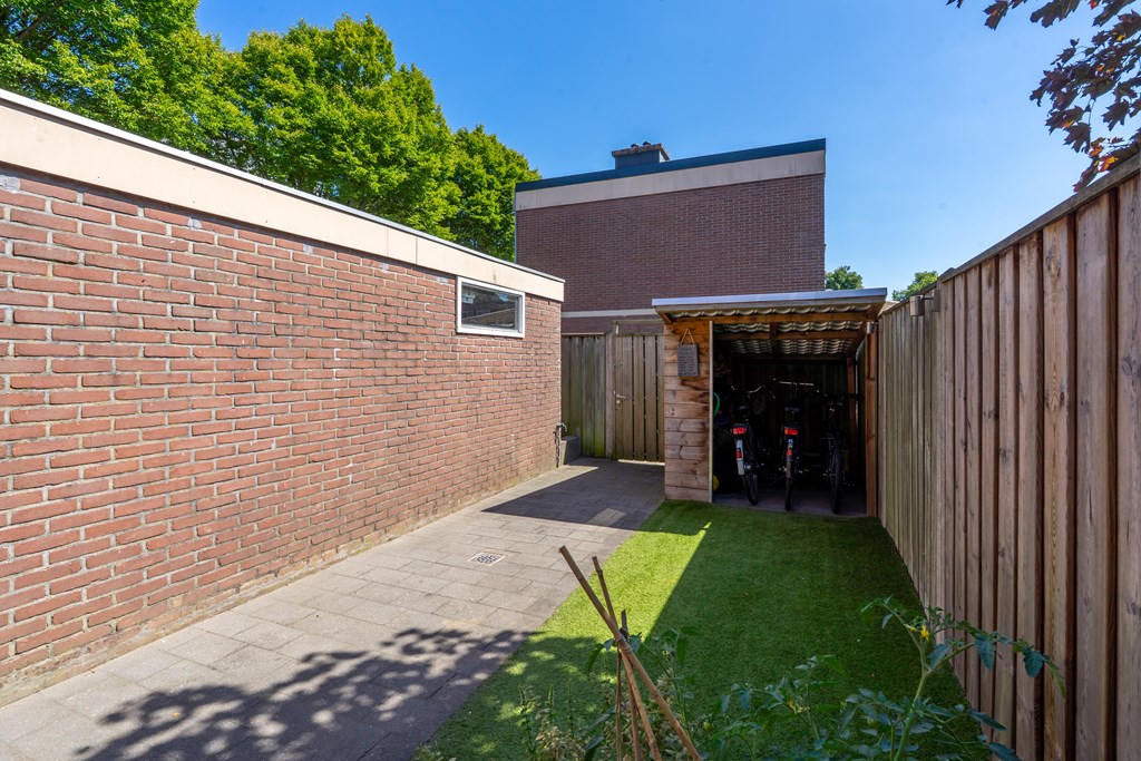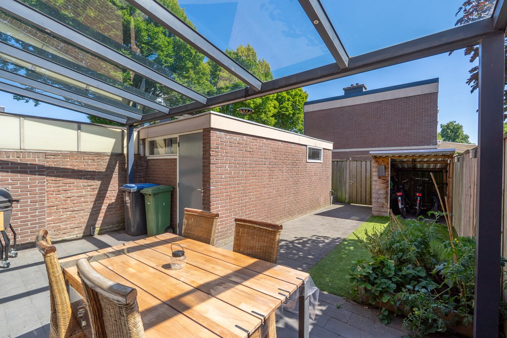 De diepe zonnige achtertuin is gelegen op het zuid-oosten. Er is een grote overkapping met zonnescherm om het gehele jaar buiten te kunnen zitten. Daarnaast is er nog een grote vrijstaande stenen berging, ideaal voor opslag van tuingereedschap. Via de achterom bereik je het achterpad. Er is een mogelijkheid om de huur van de garagebox (16 m2) over te nemen.