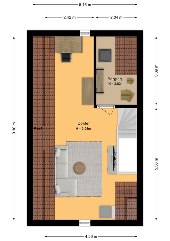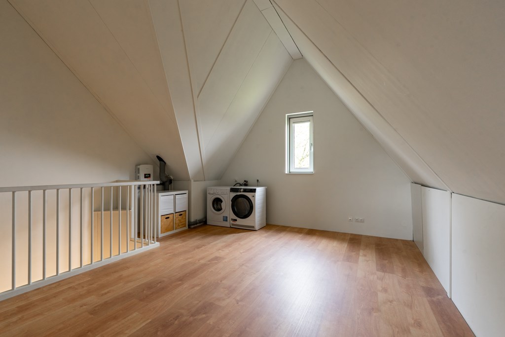 Deze verdieping is momenteel nog een grote open ruimte met witgoedaansluitingen en een aparte bergruimte met WTW-installatie. Door een verbouwing zou er een nieuwe indeling kunnen ontstaan met twee slaapkamers of bijvoorbeeld een extra badkamer.