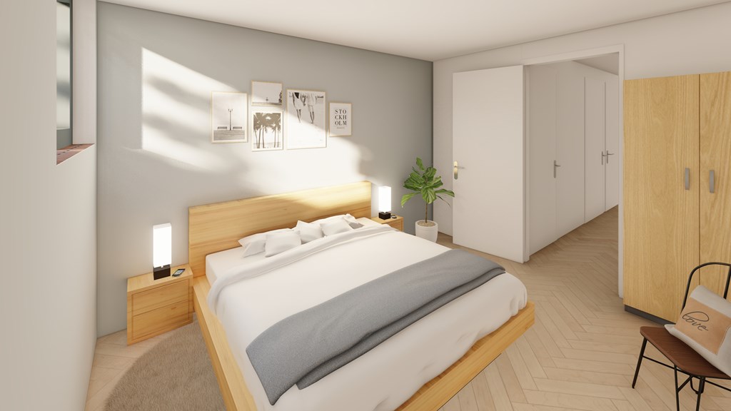 Aan de voorzijde ligt een ruime slaapkamer met daglichtinval — geschikt voor een tweepersoonsbed en garderobekast.