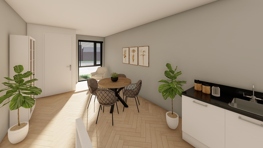 De keuken wordt niet geplaatst, maar alle aansluitingen voor water en elektra zijn voorbereid. Hierdoor kun je de keuken nog volledig naar eigen smaak (laten) inrichten. Een grote eettafel past hier moeiteloos — ideaal voor gezellige avonden met familie of vrienden.