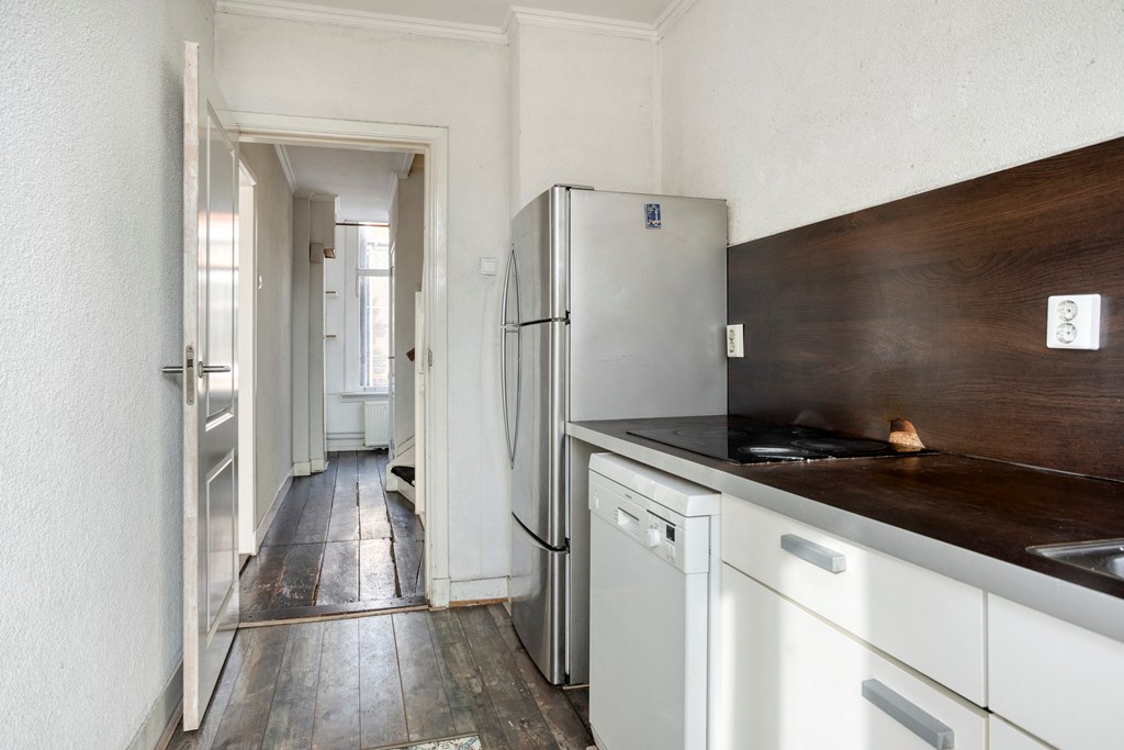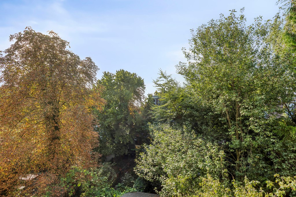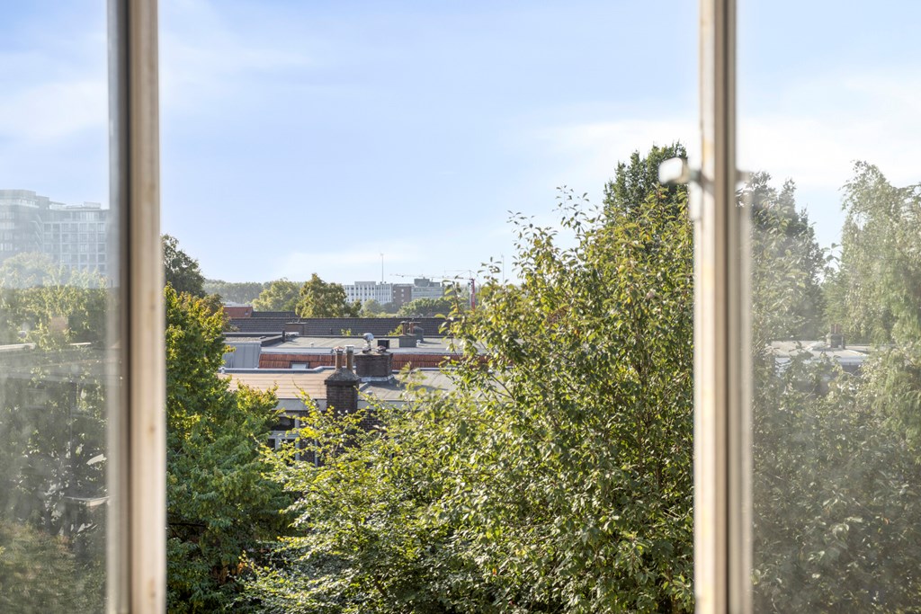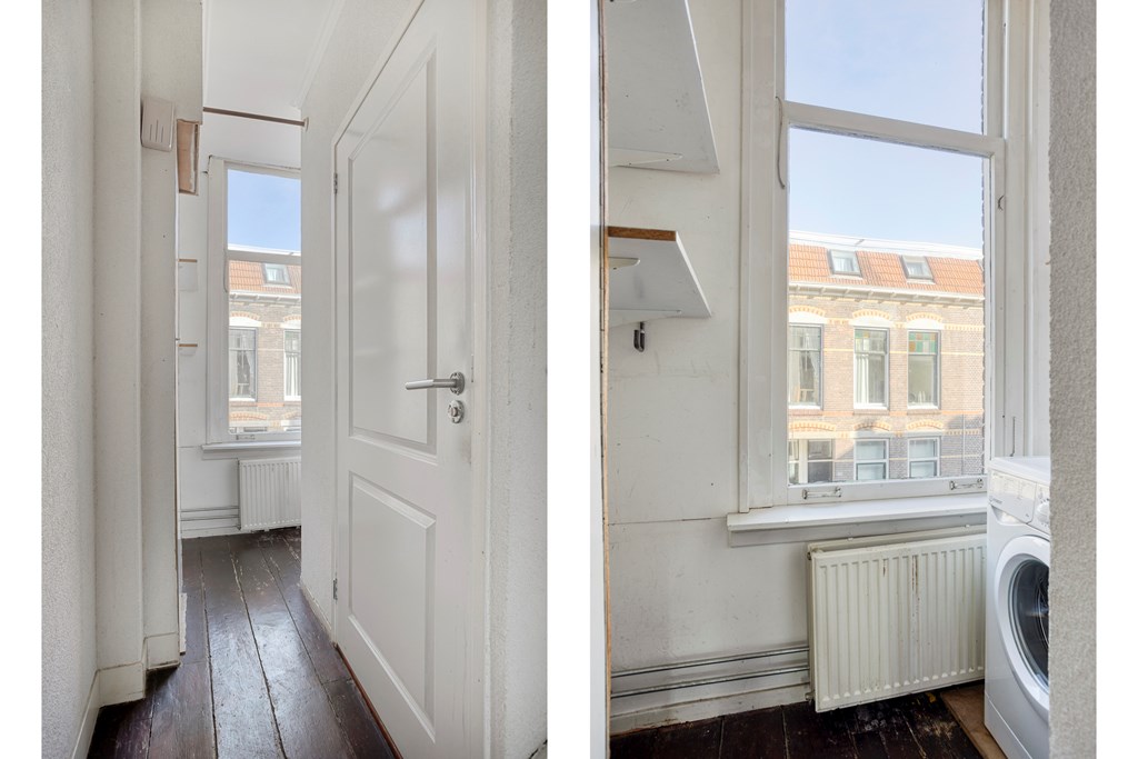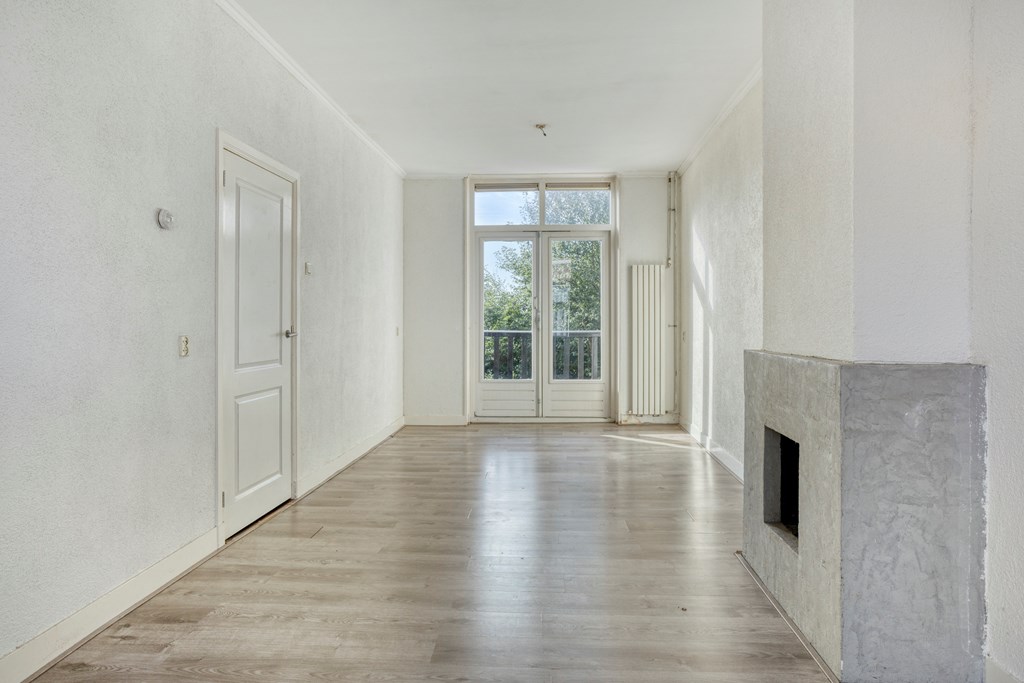 Hier bevindt zich de doorzonwoonkamer met veel lichtinval, schouw en openslaande deuren naar het balkon, dat uitkijkt op groen. De gesloten keuken is functioneel en kan – indien gewenst – worden geopend naar de woonkamer. Daarnaast zijn er een separaat toilet en een praktische ruimte op de overloop met plaats voor wasmachine en jassen.