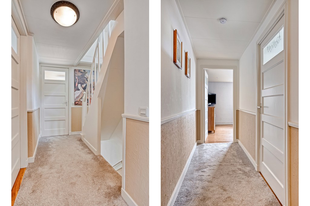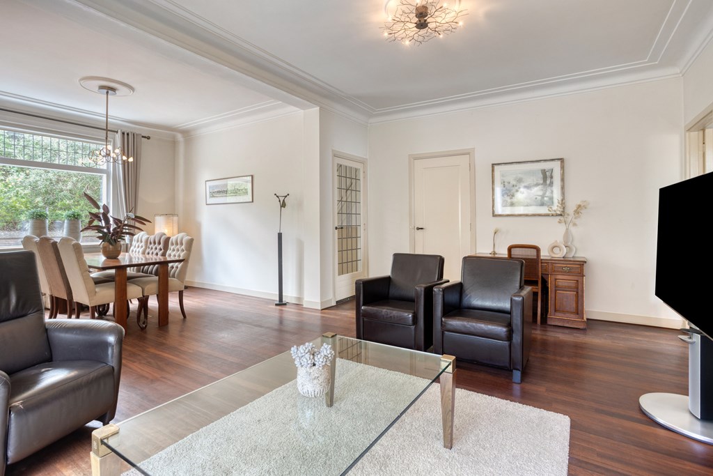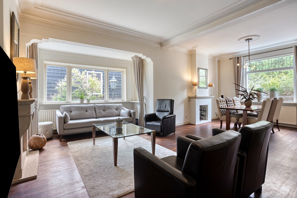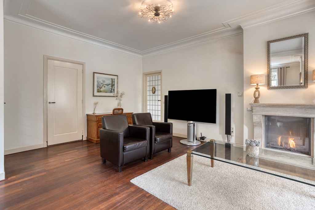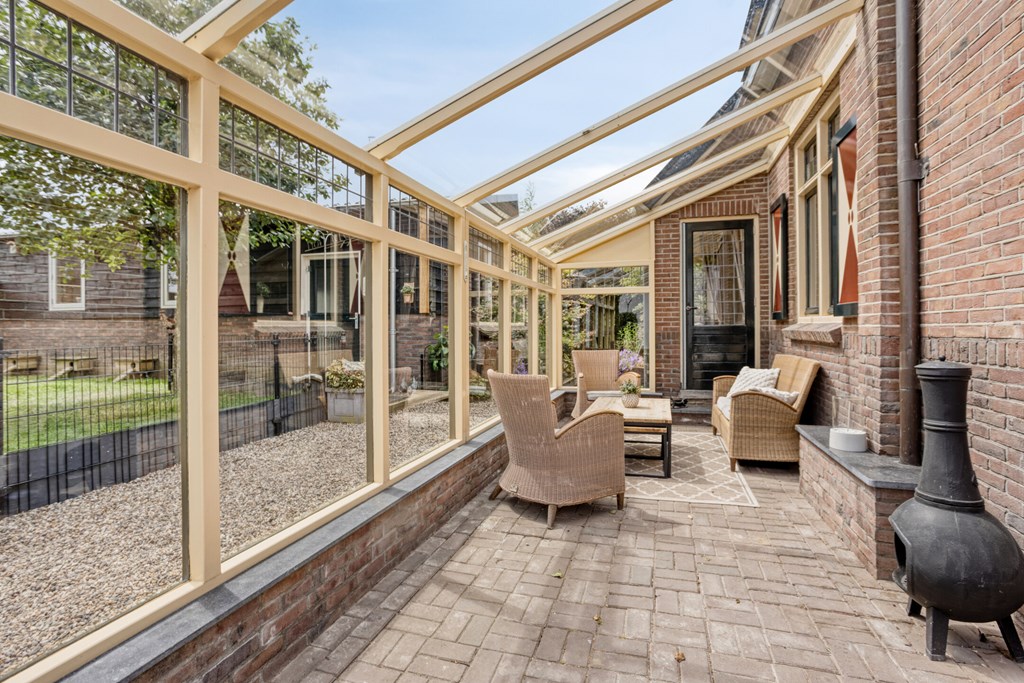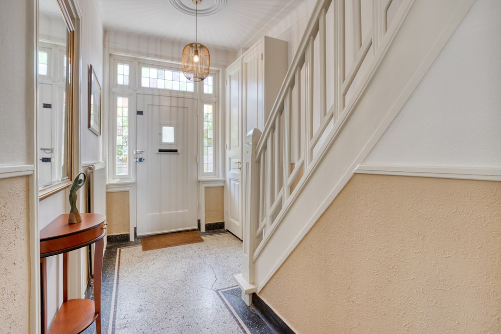 Jouw auto parkeer je op eigen terrein, er is plek voor twee auto's. Daarnaast is er rondom de woning ruimte voor openbaar parkeren. Je hebt de keuze om binnen te komen via de voordeur van de woning of de achterom via de tuin. Vanuit de voordeur bereik je de sfeervolle gang met toegang tot de 1e verdieping en woonkamer. Wat direct opvalt, zijn de karakteristieke elementen, zoals de granito vloer, paneeldeuren en glas-in-loodramen. De woon-/eetkamer is ruim en voorzien van veel grote ramen. De erker geeft extra ruimte en sfeer aan deze kamer. Er is een gashaard voor extra sfeer of eventueel als bijverwarming in de koude wintermaanden. Er is een buitendeur om naar de serre te gaan.