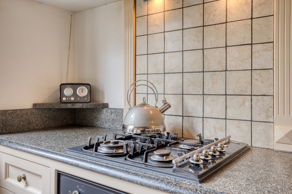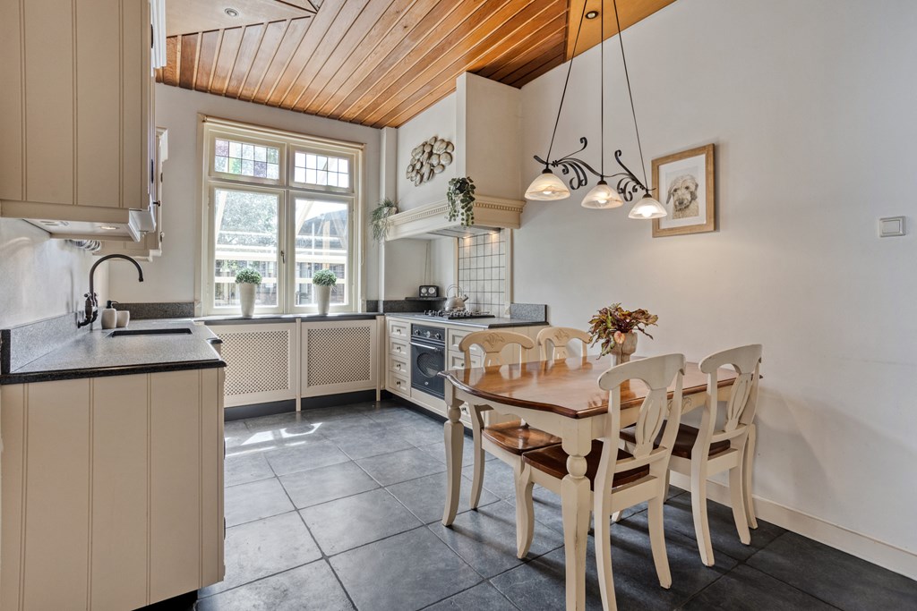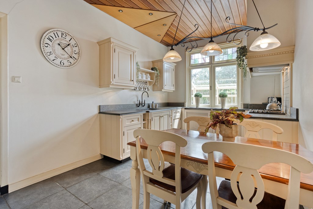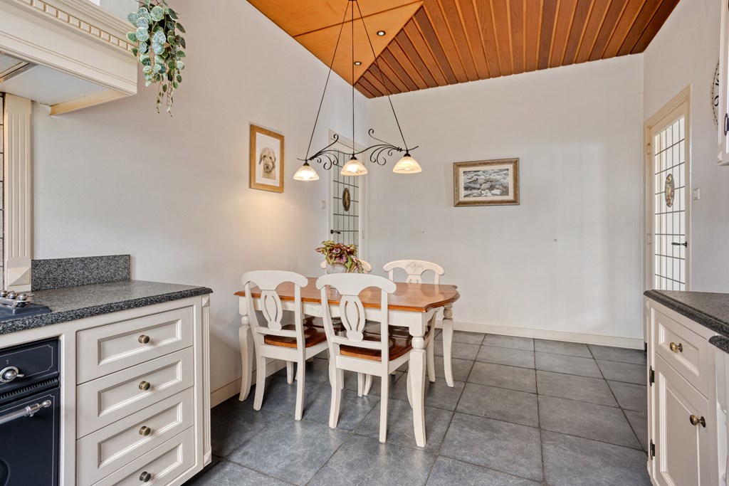 Vanuit de woonkamer heb je ook toegang tot de kelder (circa 14 m2) voor opslag. De keuken is momenteel gesloten en bereikbaar via de volgende binnendeur. Er is een mogelijkheid om deze tussenmuur te doorbreken om een nog grotere woonkamer met open keuken te realiseren. De keuken is landelijk en voorzien van diverse inbouwapparatuur. Je kunt hier een tweede eettafel kwijt en vanuit de keuken heb je leuk uitzicht over de groene tuin.